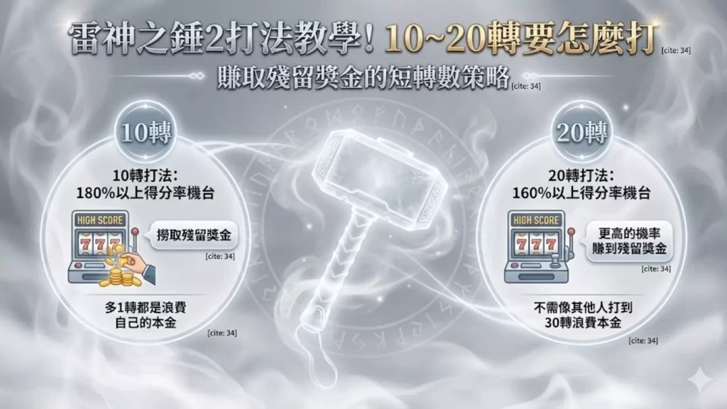 雷神之錘2用20轉去打其實跟10轉差不多意思,不過針對雷神之錘2得分率就會下降一點,這裡主要選擇160%以上的得分率的機台下去打,會有更高的機率可以賺到殘留獎金,畢竟我們本金就不多加上只有20轉為限制,那麼就不需要像其他人打到30轉或者更高去浪費本金測機台。